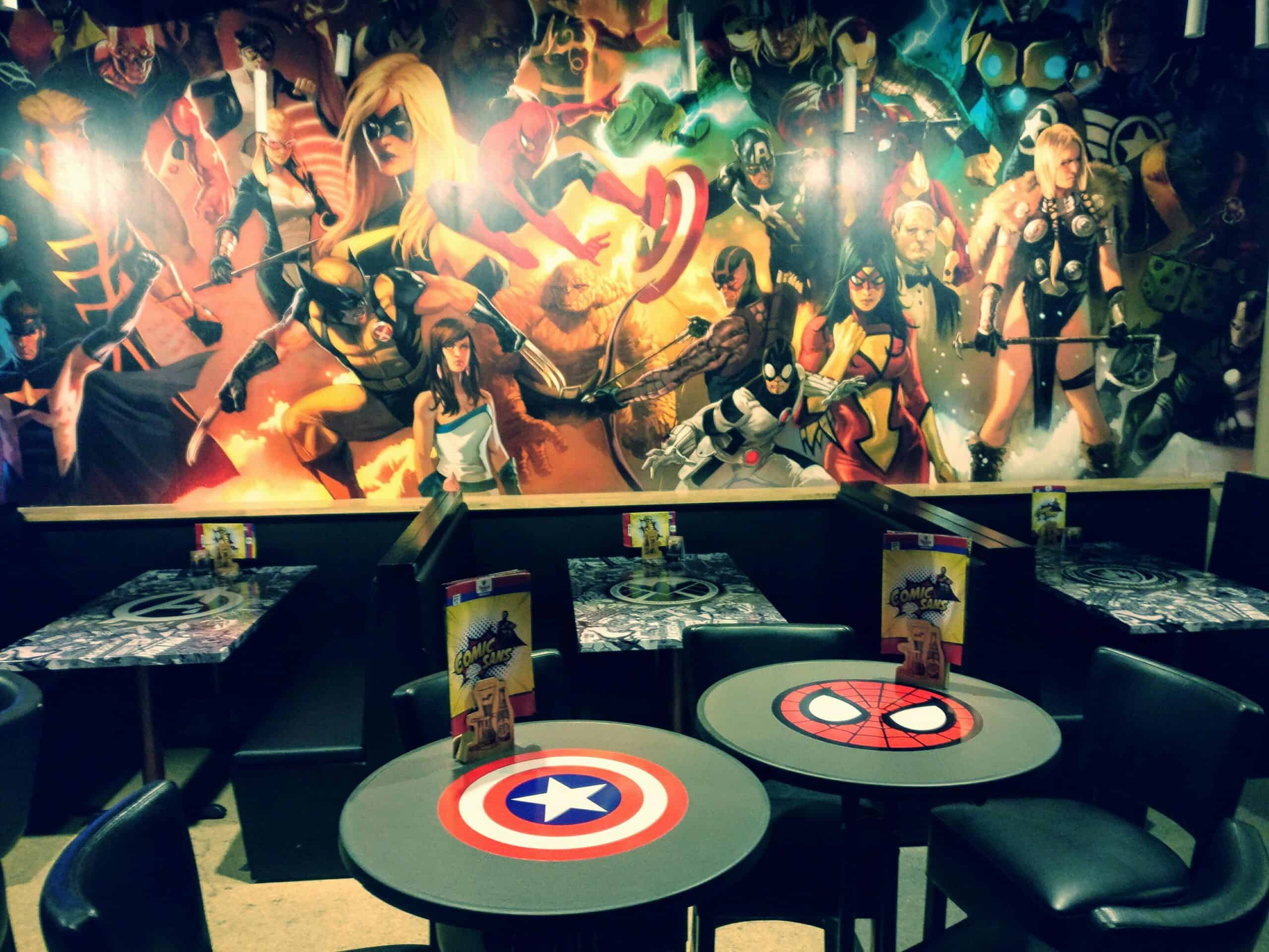 In de Comic Sans kan je spellen spelen, zoals tafelvoetbal, maar nog specialer zijn de consoles in de multiplayer room en de talrijke pinball kasten. De uitbater Jeroen heeft zich als eerste in Belgie weten te plaatsen op de kaart van thema-gerichte Geek cafe’s. En dat kan je zien. Elk jaar wordt er verandering aangebracht, zijnde uitbreiding van de games, maar ook het decor in het interieur. Hij maakt zich ook sterk door op de Cons aanwezig te zijn, met acteurs en tekenaars van het Comic gebeuren, die je kan bewonderen aan de muur. Wanneer je plaatsneemt aan één van de tafels zal je al direct zien dat deze over superhelden gaat. Een streling voor het oog om te zitten bij je favoriete superheld toch? De muziek die speelt in de bar is er één van de hardere soort, niet verwonderlijk dat je ook nog bekend publiek kunt tegenkomen in deze bar, zoals de spelers van Prima Nocta of de organisatie van de Comic Cons.